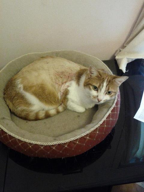 Please SPAY/NEUTER all your pets! Our Deedee was attacked in our backyard by a feral orange tomcat. She is covered in deep scratches from shoulders to hips and has serious bite wounds on her chest. Our other cat Vinny, saved her by charging into the fray and knocking off the attacker before I could even react. The Vet said this is the worst cat-on-cat attack she's ever seen. The City would not give me a trap tonight due to freezing weather, but hopefully next week it will be warm enough to try to trap the attacker.