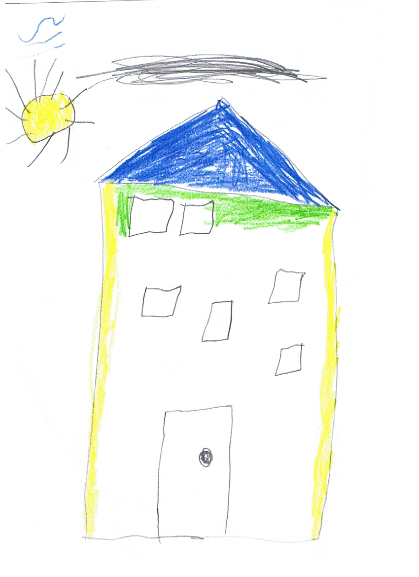 Our house drawn by my 5 year old son. With three kids, it is just too much to save all their artwork. I have them choose a couple at a time to display. The rest are scanned in to the computer & the hard copies are discarded.